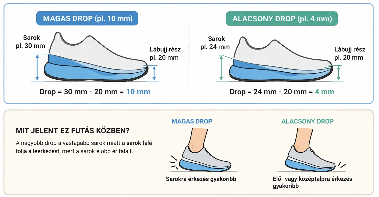 A drop a sarok és az orr közti magasságkülönbség milliméterben. Befolyásolja a terheléselosztást és részben a talajfogást, ezért nagy váltást nem érdemes hirtelen meglépni.